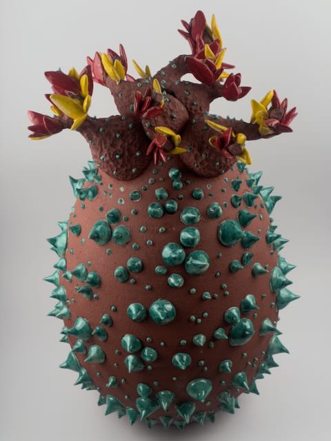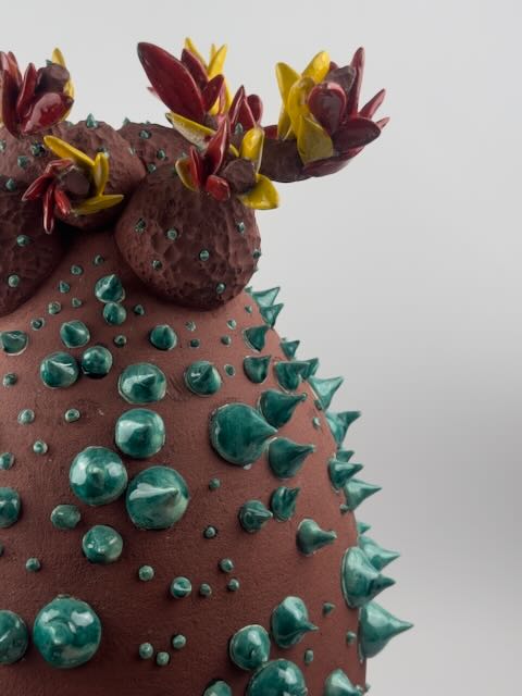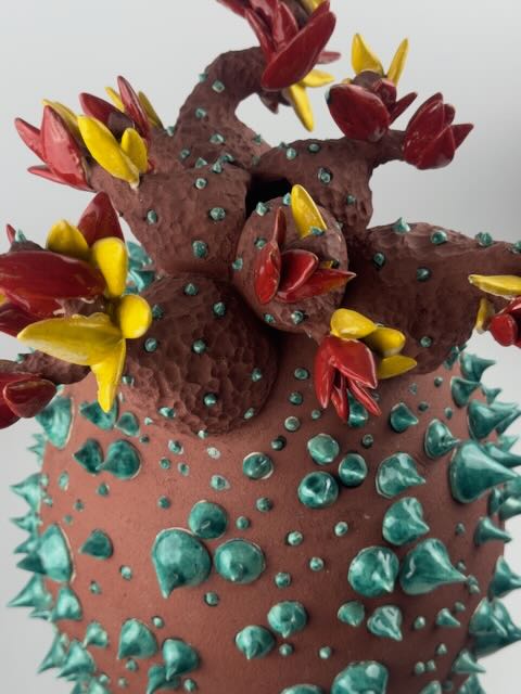 Realizzata in semi gres rosso, al tornio e modellata a mano. Decorata a mano con applicazione di ingobbio bianco e successivamente con cristalline colorate.