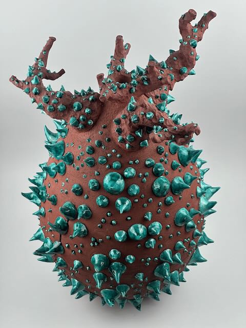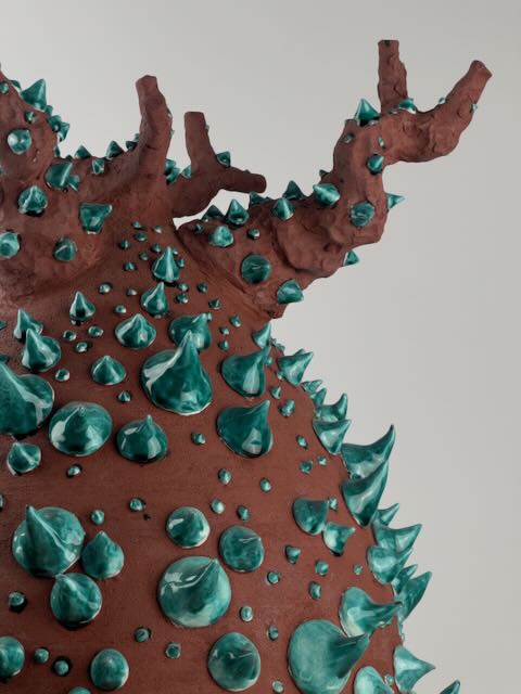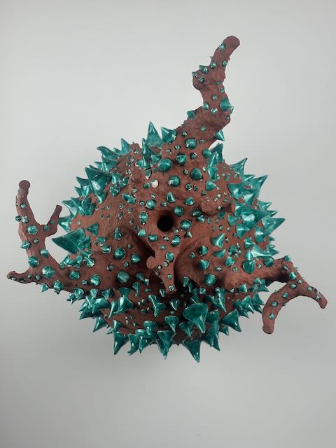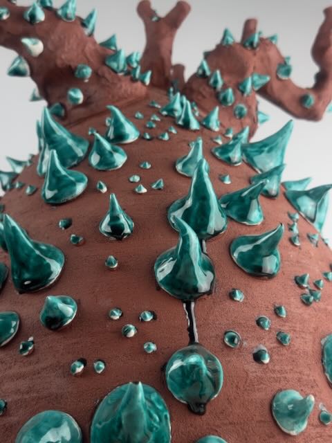 Realizzata in semi gres rosso, al tornio e modellata a mano. Decorata a mano con applicazione di ingobbio bianco e successivamente con cristalline colorate.