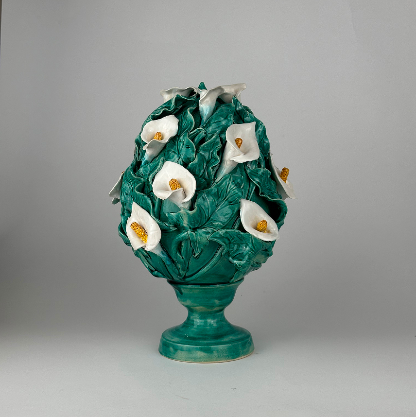 Realizzato al tornio in gres bianco. Modellato e decorato a mano con tecnica mista.