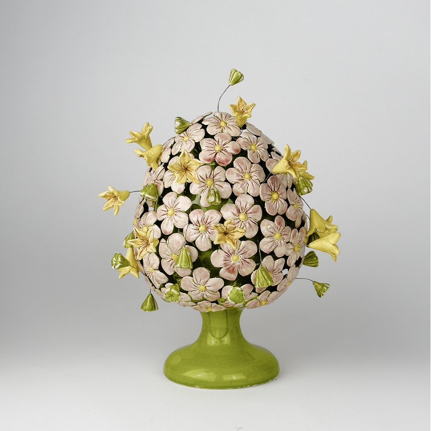 Realizzato al tornio in gres bianco. Modellato e decorato a mano con applicazione di cristalline trasparente matt e colorata lucida, arricchito da infiorescenze colorate.